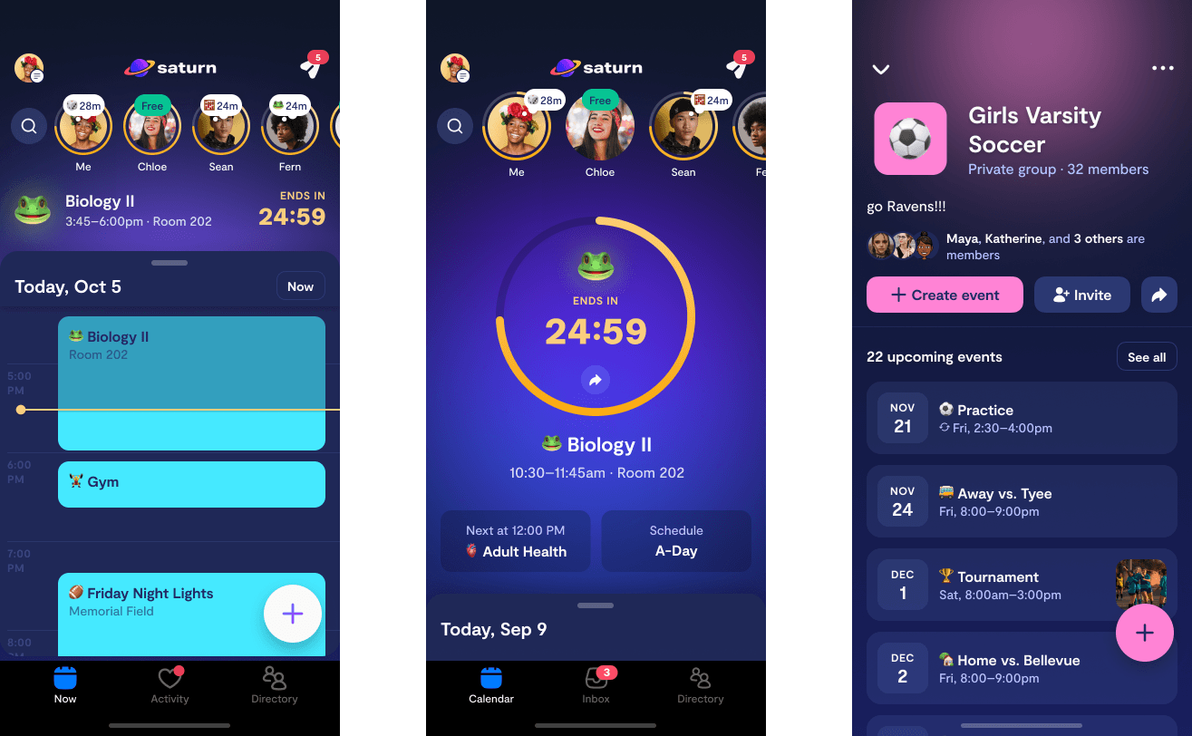 Saturn is a calendar, first and foremost. We help students keep track of where they need to be and when. Students can share their schedules with their friends to see who's in their classes at the beginning of the year.