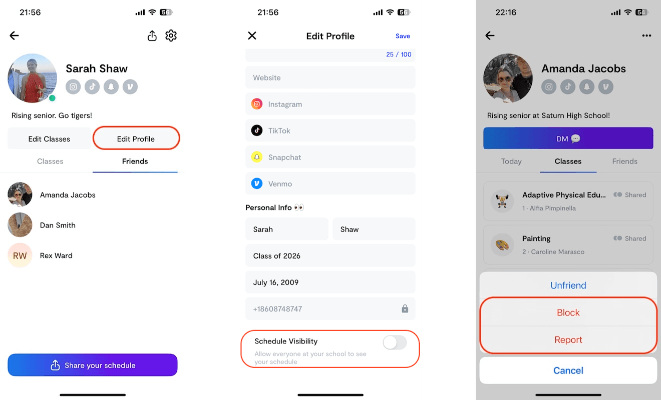 Each Saturn community is designed for students at a specific high school who share common schedules. Users who declare a college in their profile are able to send friendship requests to, and accept friendship requests from, other users who have declared the same college or who are already part of the college's Saturn community.